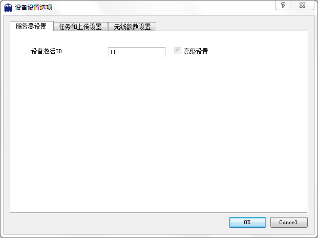 点击【设备设置】选项后会弹出设备设置选项对话框,对话框中包括服务器设置、任务和上传设置、无线参数设置